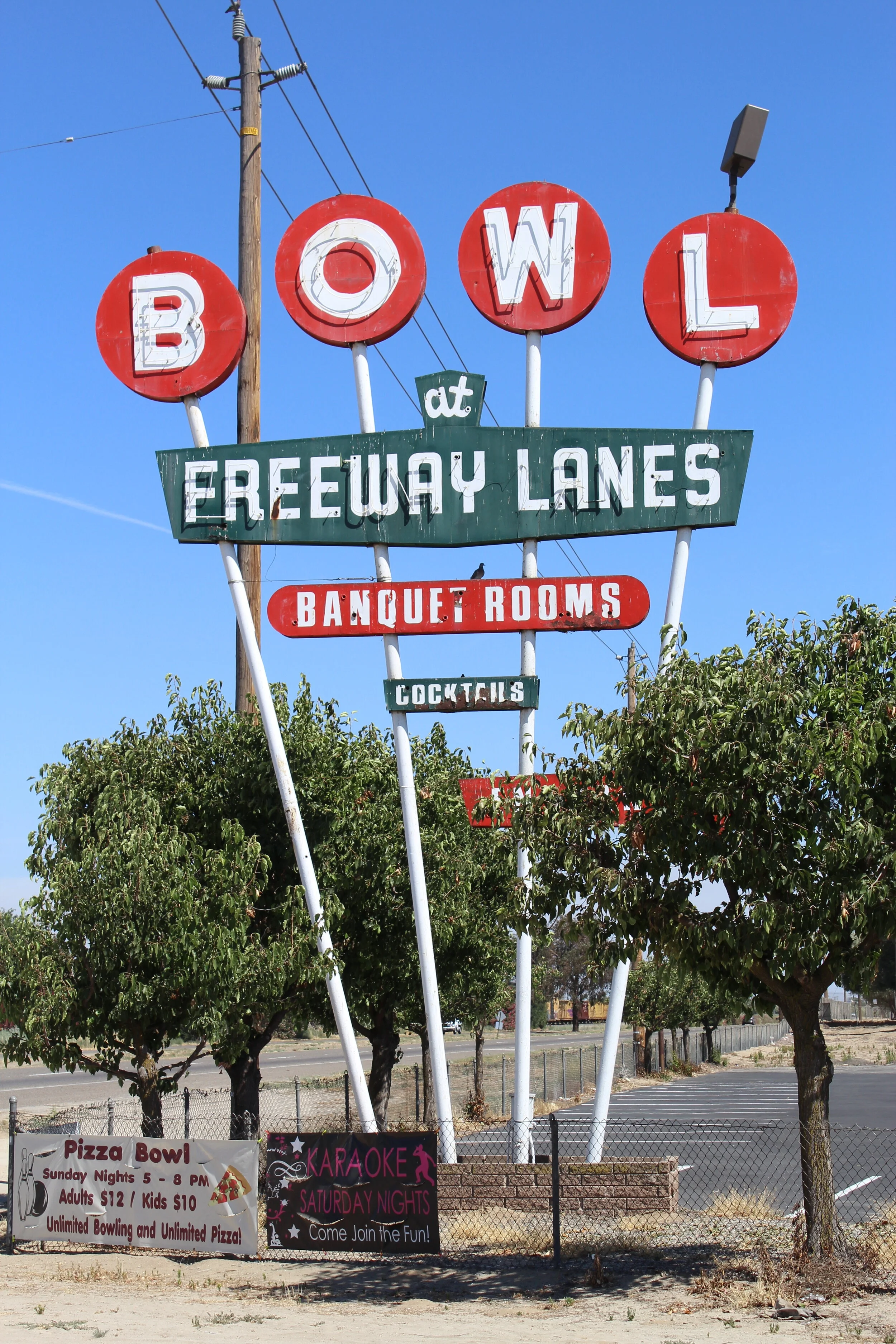 Bowling alleys were once common sights along highways across the country. Frontier Lanes, shown here, was built along Golden State Boulevard in Selma, California, a section of old Highway 99 now bypassed by a freeway just to the west. Bowling alleys and another highway staple, drive-in movie theaters, have both dwindled in number as interstates have replaced old rural highways.