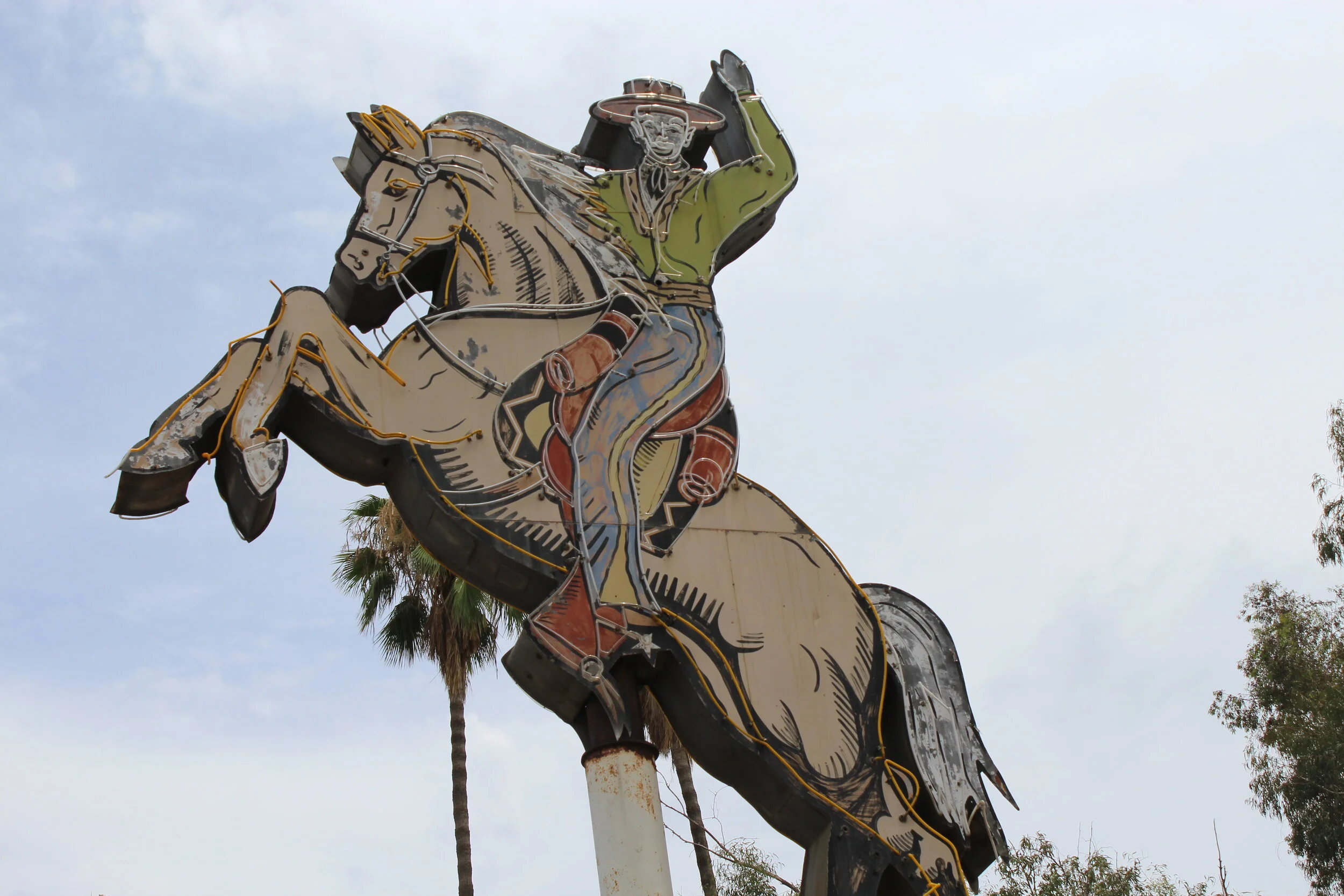 This neon (not rhinestone) cowboy once waved at travelers along Highway 99 in Fresno from his perch atop a sign at the Hacienda. The city’s most glamorous hotel during the 1960s, it hosted big-name entertainers and boxing matches in its heyday. The sign’s twin from the Las Vegas hotel of the same name is still visible at the north end of the Strip. Learn more about the Hacienda in my book Fresno Growing Up.
