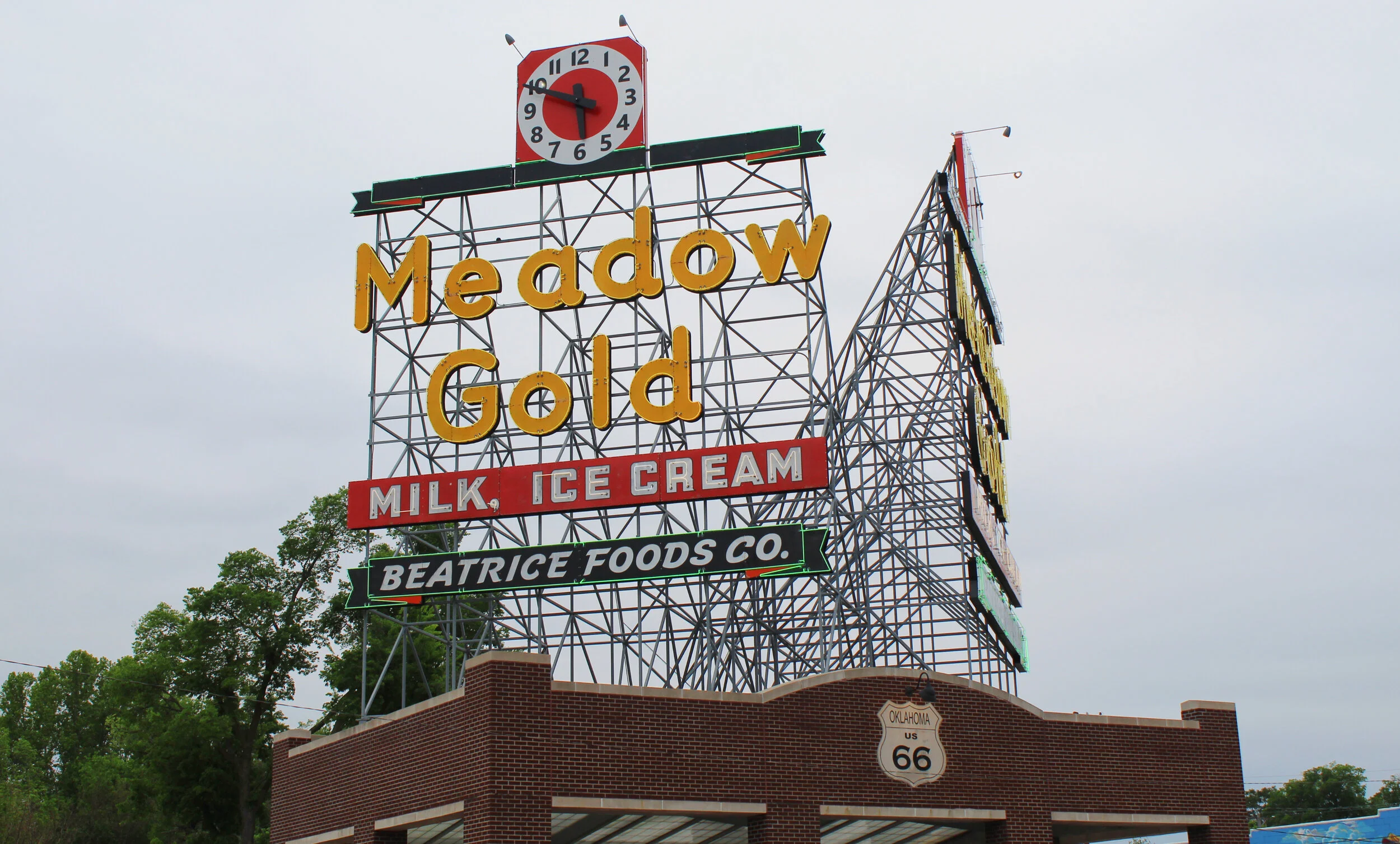 The Meadow Gold neon sign dates back to the 1930s in Tulsa, Oklahoma. It stood watch at 11th Street and Lewis Avenue until 2004, when the building that supported it was torn down. The sign, however, was saved and gifted to the city, which put it in storage until it could be reassembled and installed atop a single-story structure on historic Route 66.